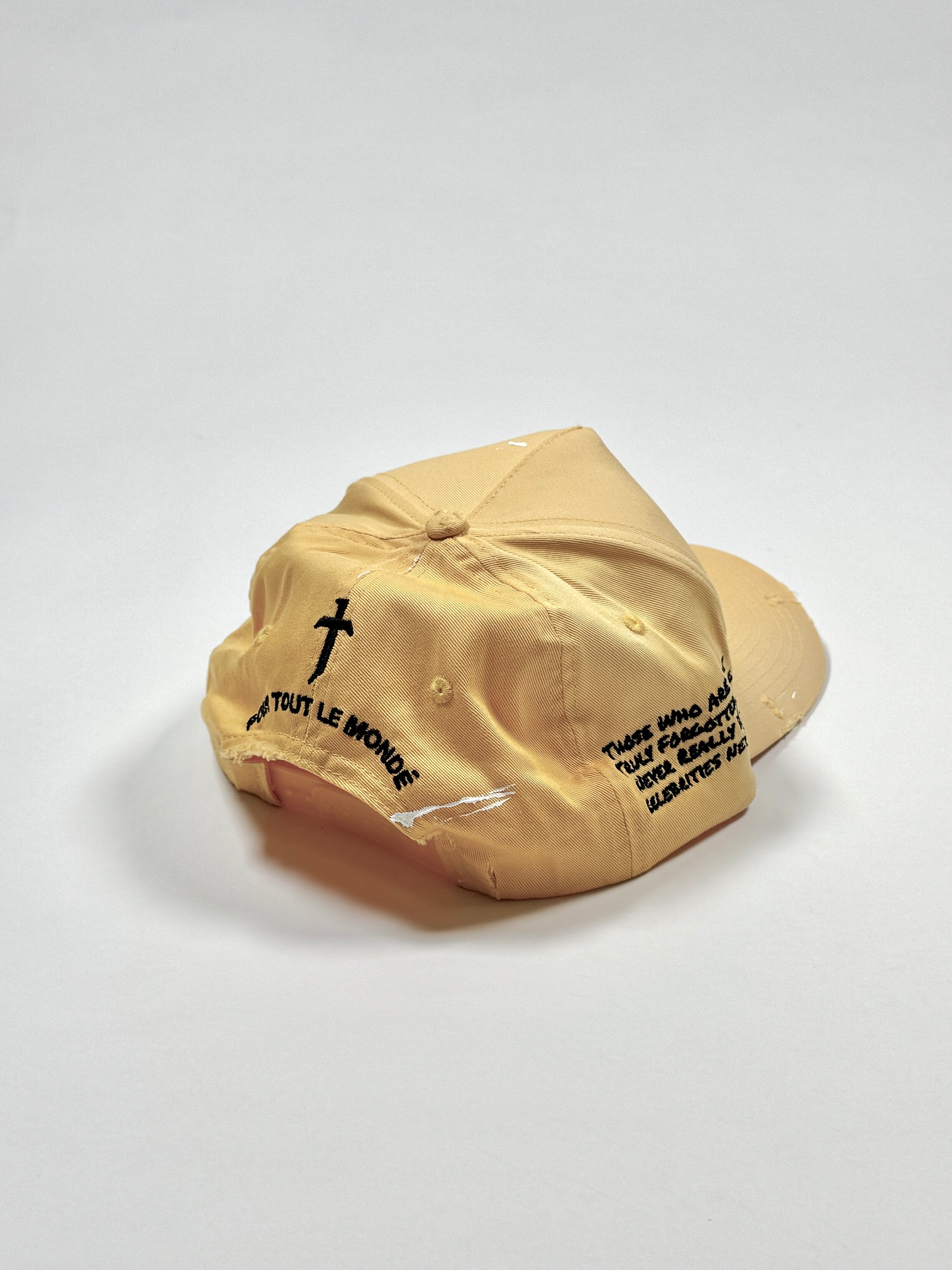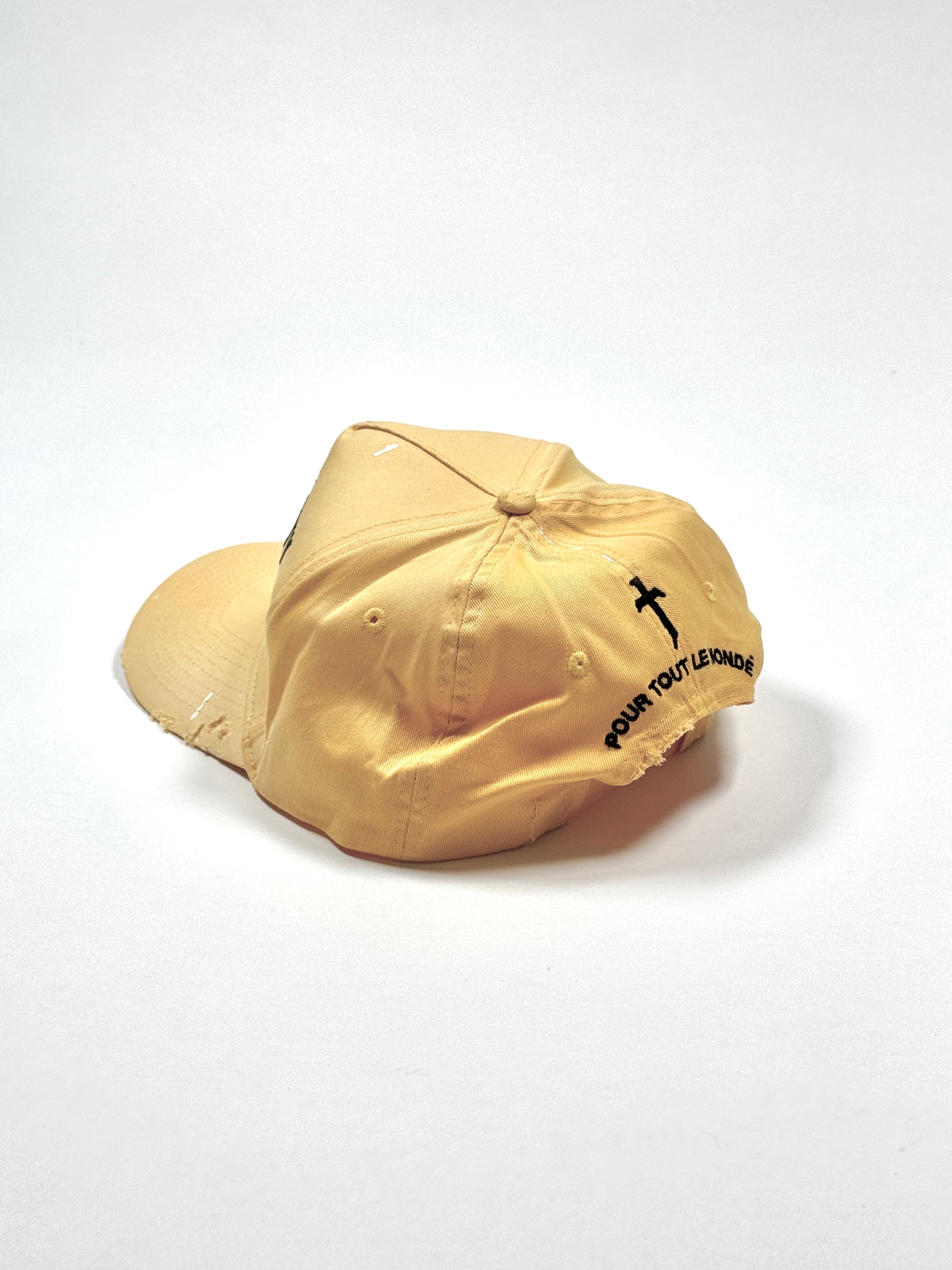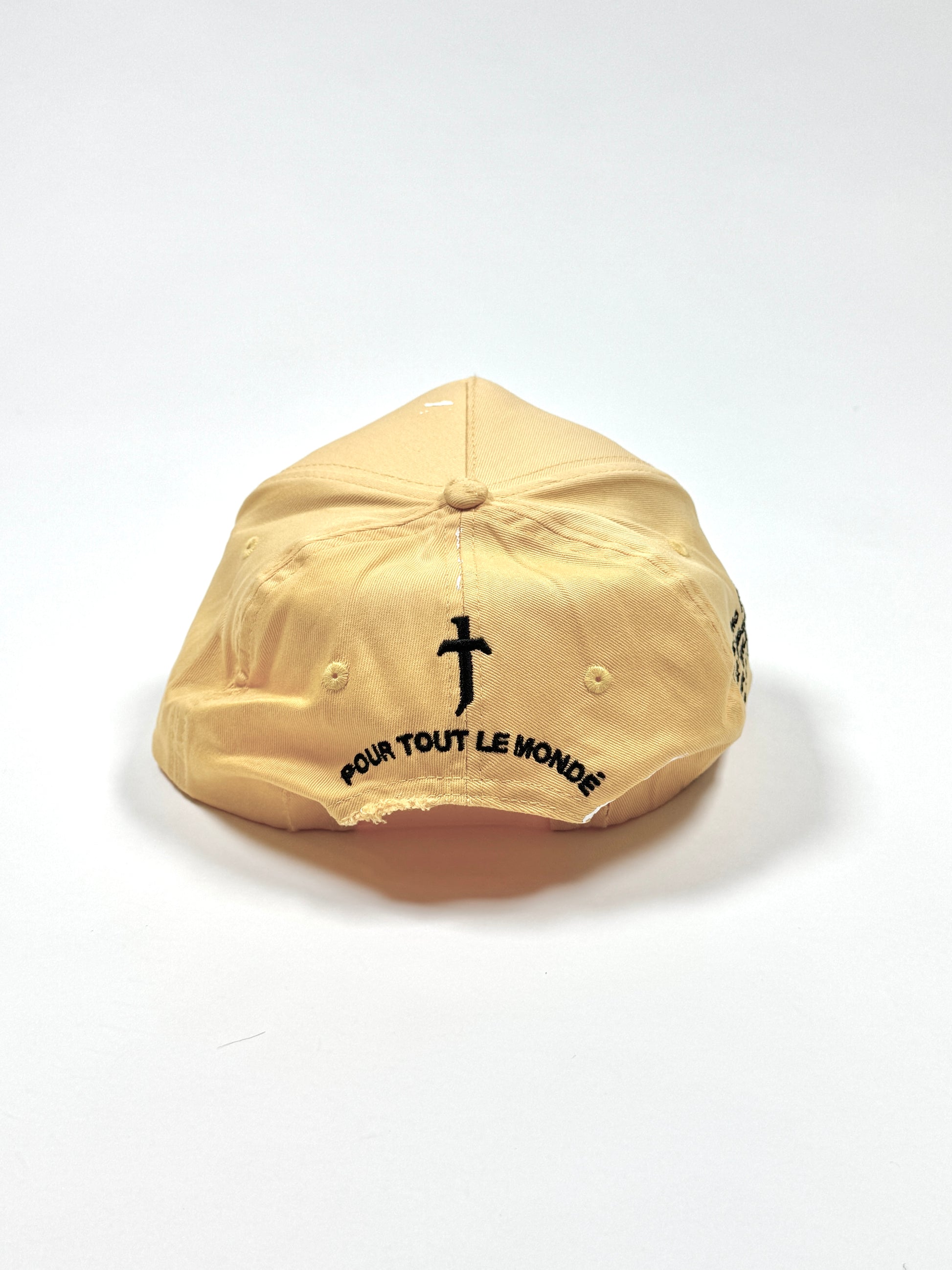 CLASSIC 5 PANEL COTTON TWILL TRUCKER HAT IN FADED YELLOW. HAND DISTRESSING ON FRONT, SIDES, TOP AND BACK. WORN IN FADING FOR A PERFECT VINTAGE LOOK. CLASSIC PAINT APPLICATION MARKING AND FADE SPOTS DONE BY HAND. PERFECT POINTED CROWN FIT WITH SNAPBACK CLOSURE