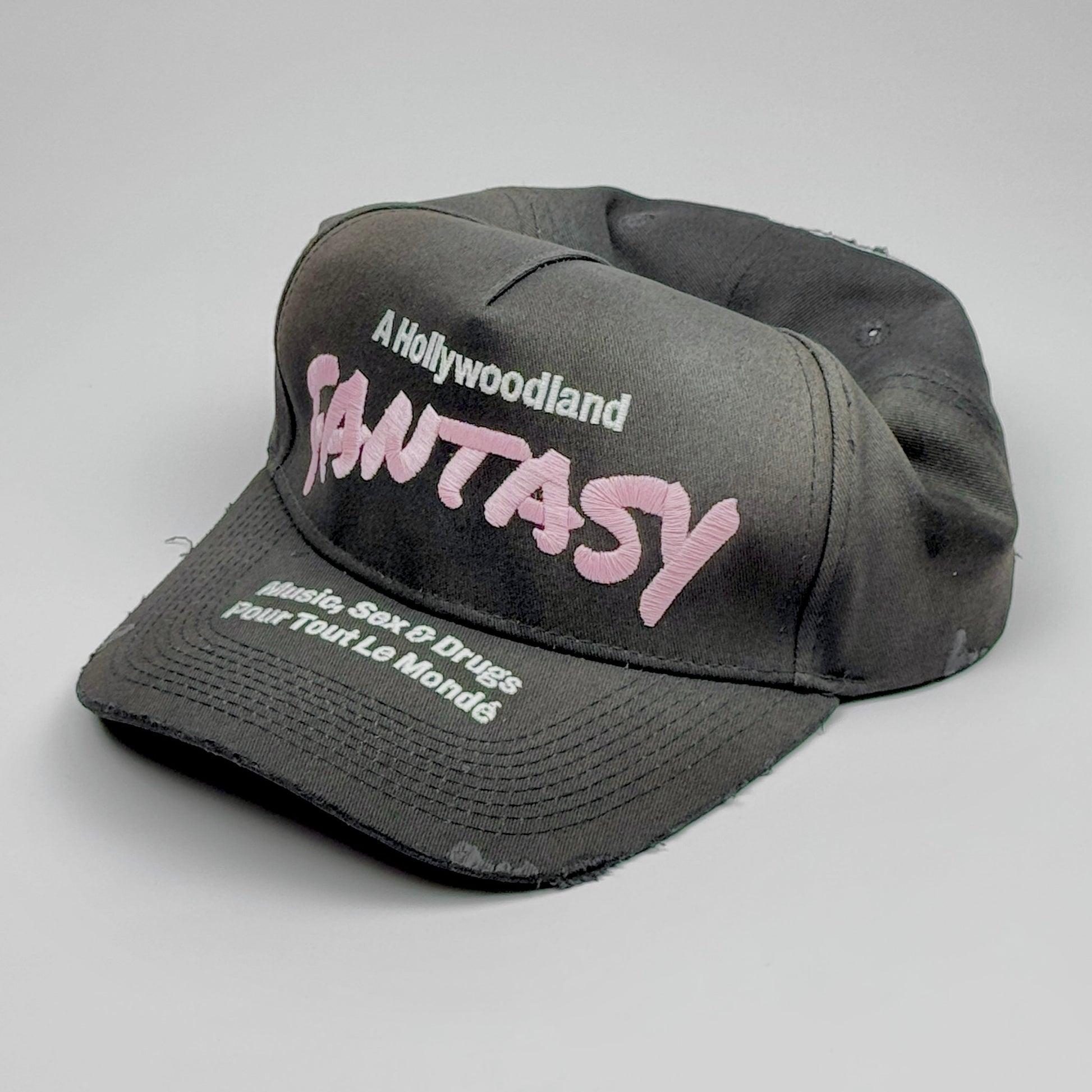 UNISEX VINTAGE FIT 5-PANEL COTTON TWILL BASEBALL CAP IN SUN AGED BLACK. SPECIAL TDP WASH TREATMENT WITH EMBROIDERED ARTWORK AND HAND APPLIED DISTRESSING AND PAINT DETAILS
